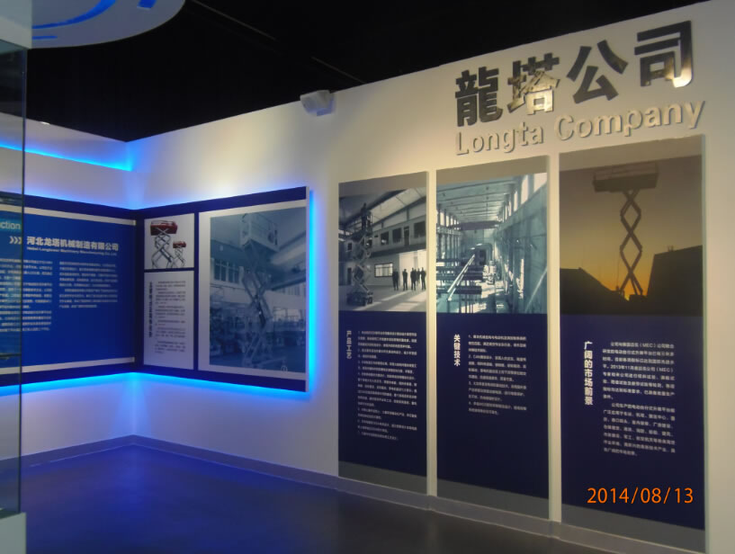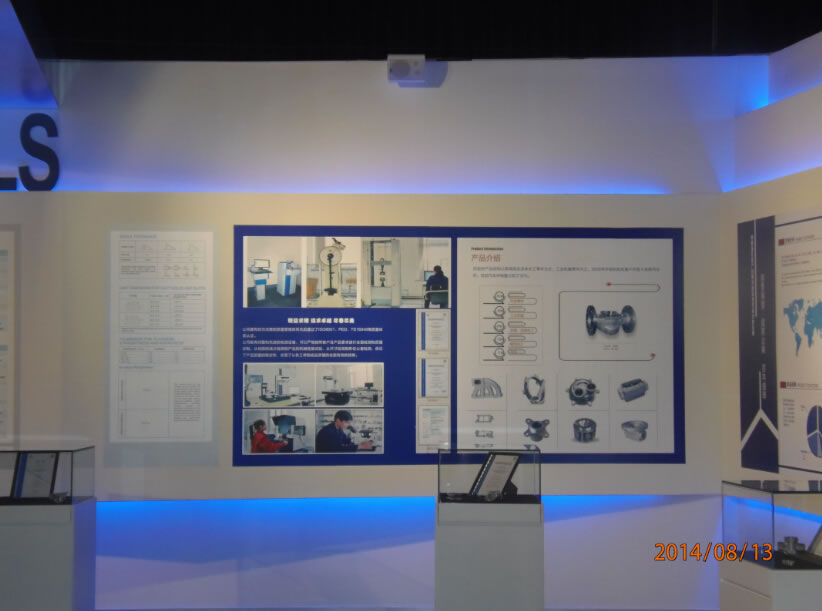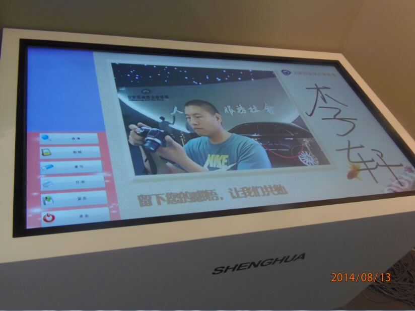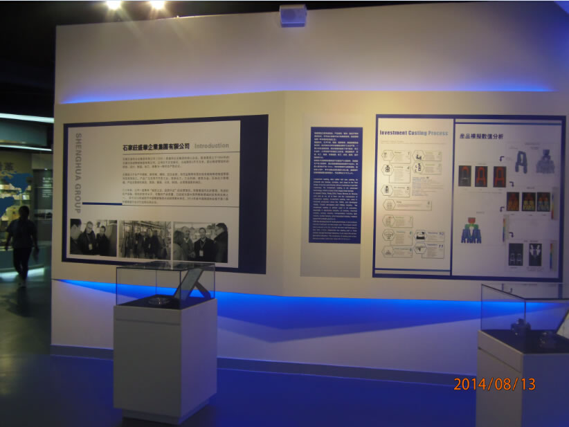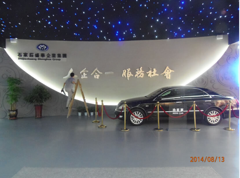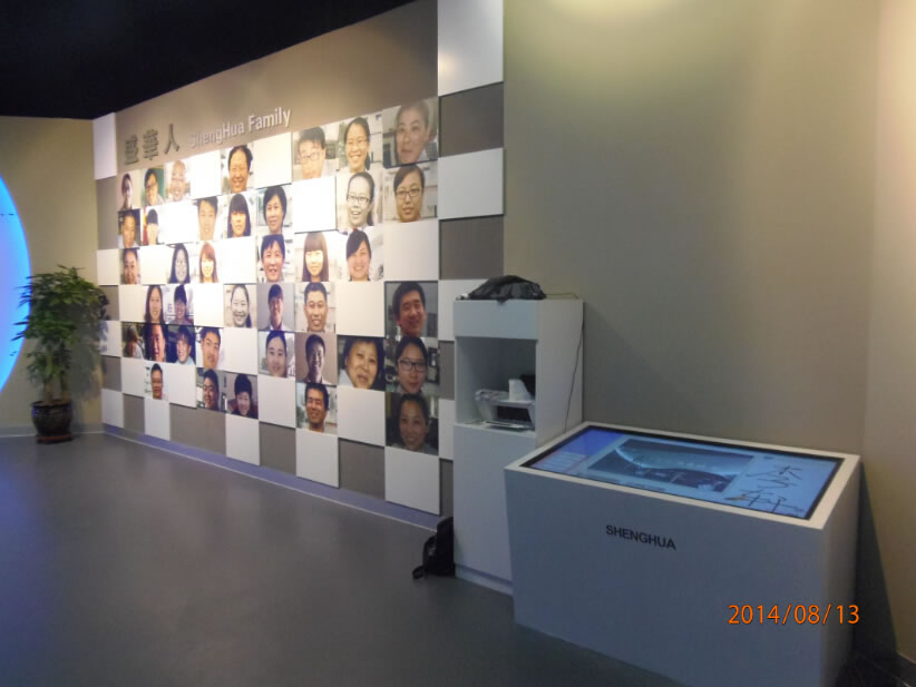 石家莊盛華企業集團企業展廳聲光電系統:領導關懷55寸液晶觸摸屏一體機、電子簽到拍照留念虛擬翻書投影機互動投影機融合、講解音響、展廳背景音樂等。